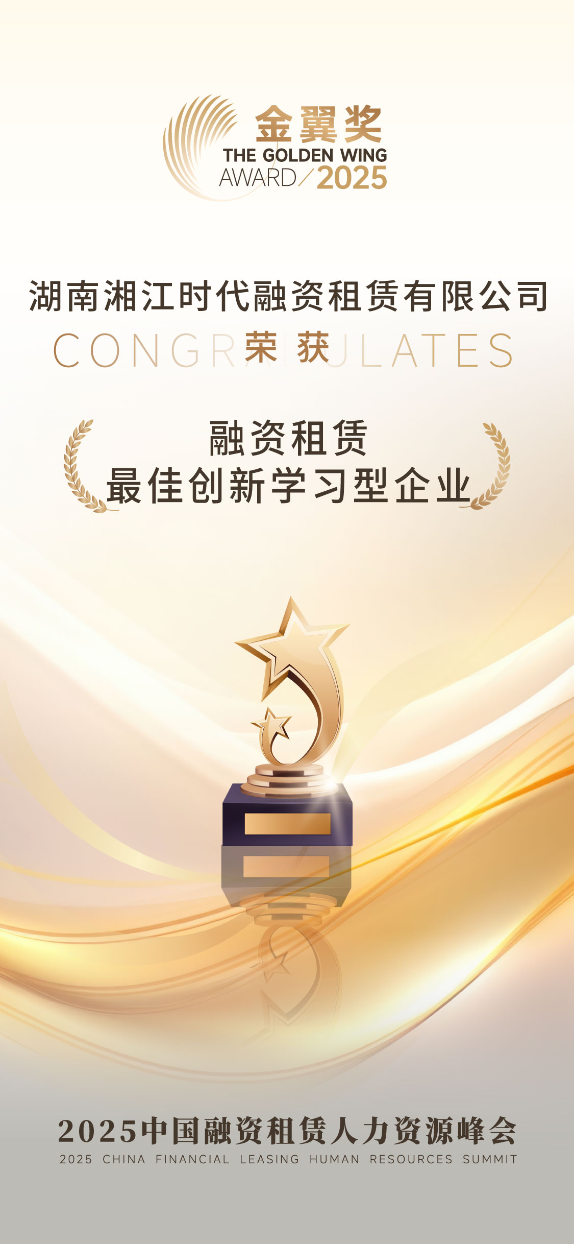 近日,由融易学主办的“2025第二届中国融资租赁人力资源峰会”在深圳圆满落幕。融资租赁金翼奖多项荣耀奖项重磅揭晓。湖南湘江时代融资租赁有限公司荣获“融资租赁行业最佳创新学习型企业奖”。